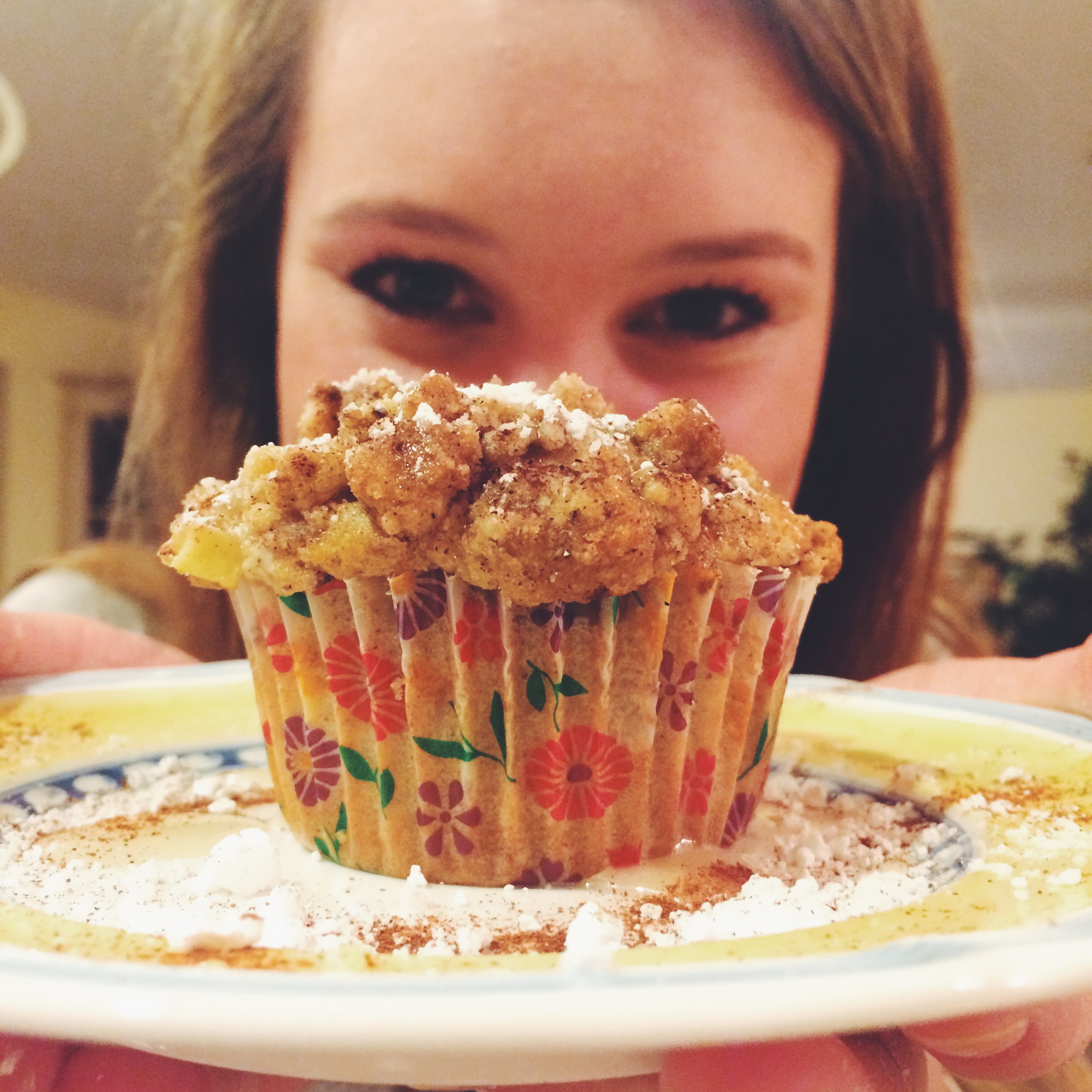 Bake the muffins for about 7 minutes at 425 (This allows the crumb topping to cook and get a bit of a crispy texture), then turn the heat down to 325 and cook for another 20-25 minutes. When you pull them about of the oven, adding the glaze right away will cause it to melt right into the muffin… and I found that this is absolutely delicious!
