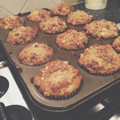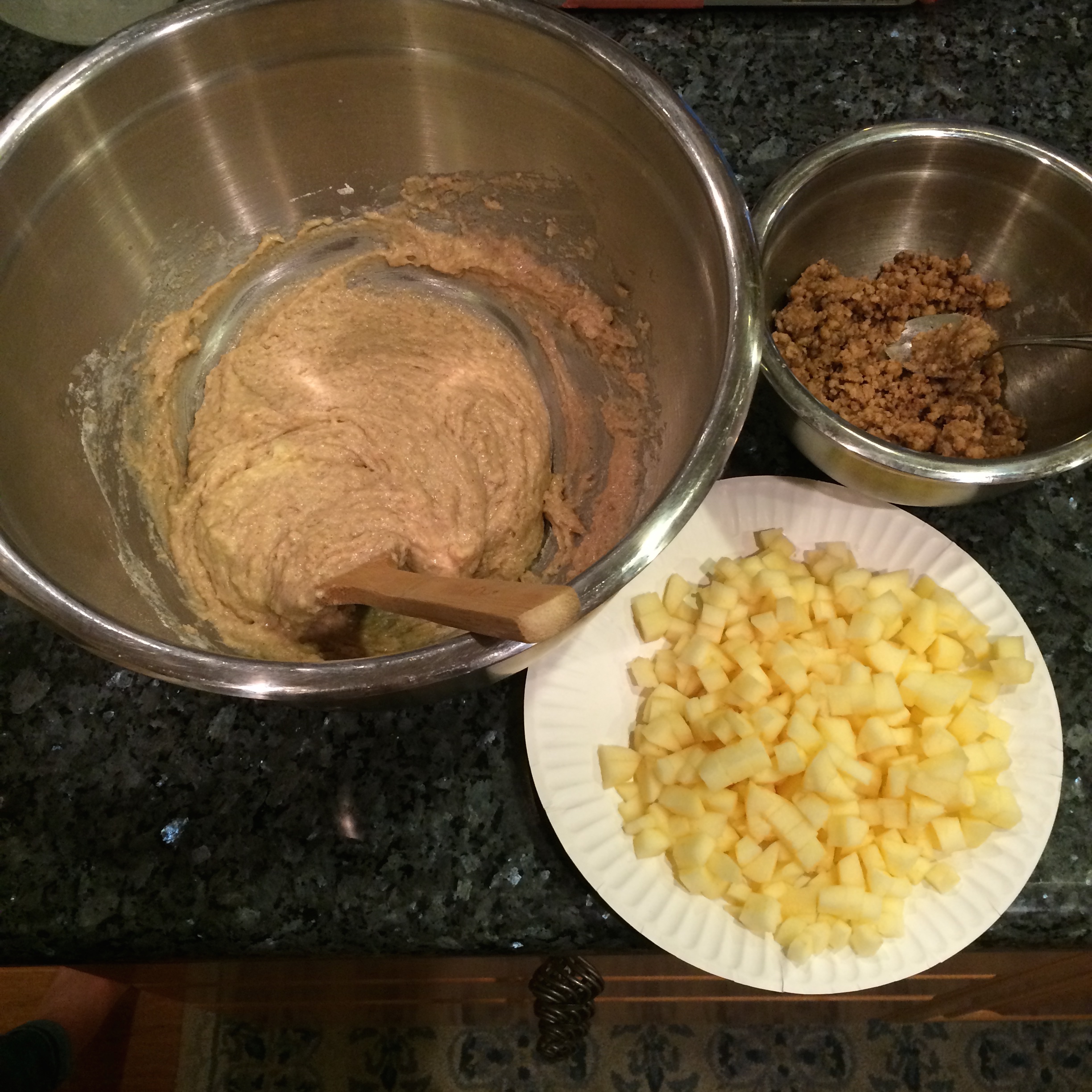 From there, fold in the cubed apples. Once this mixture is complete, pour it into your muffin tin. For the crumb topping (which is cooked on top of the muffin mixture, mix together the ingredients until crumbly texture is achieved. Pour the crumb mix over the muffin mix.